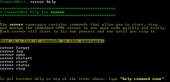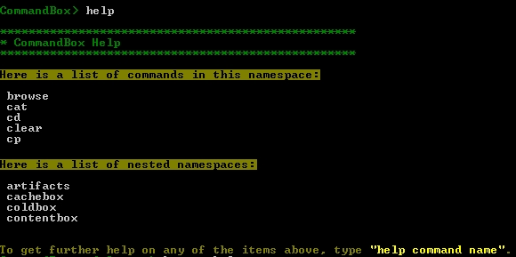 Help is integrated at every level in CommandBox. You can help global help, namespace help, or command help at any time.