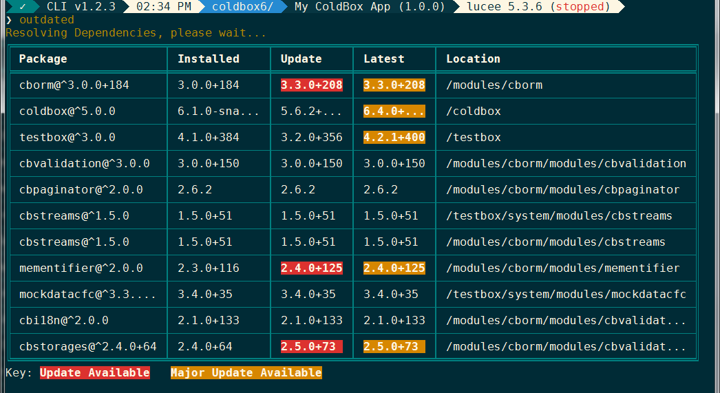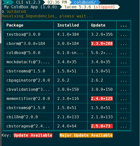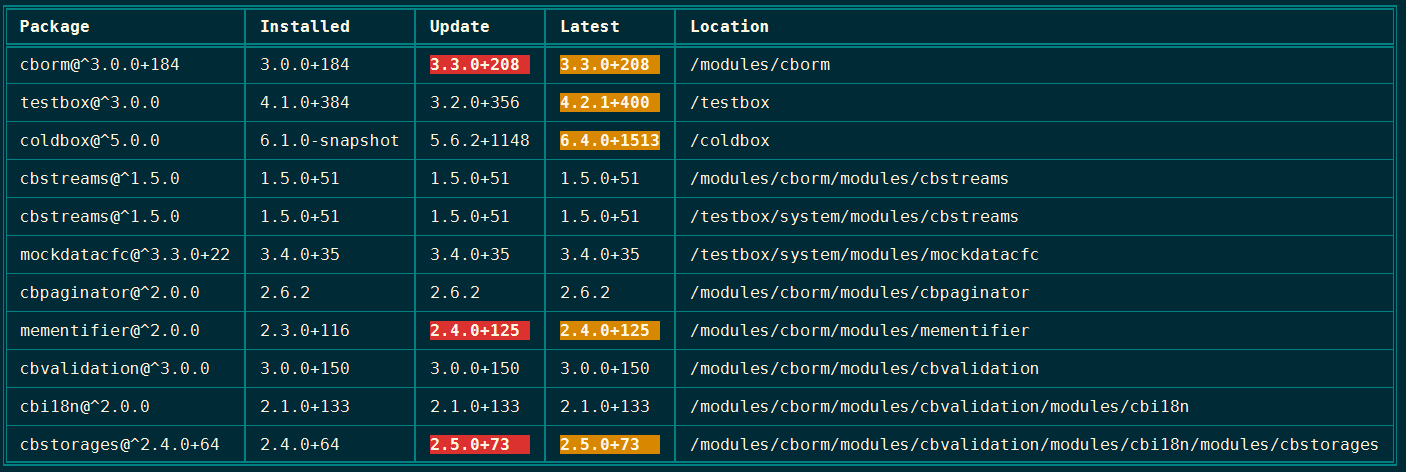 The print helper contains a feature that will generate ASCII tables to print tabular data from the CLI. The easiest way to see what this looks like is to run the outdated command in the root of a project:
