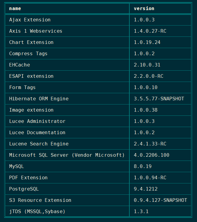 You can limit the columns that display in the table regardless of whether you use an array of data or a query object by using the includeHeaders parameter. This example outputs a sorted list of the names and version of all the Lucee Extensions installed in the CLI. (extensionList() is a built in Lucee function that returns a query object)