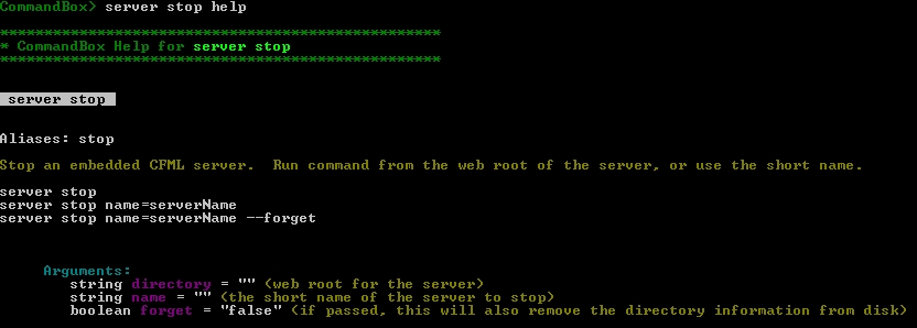 For a full list of all the commands that ship with CommandBox as well as all their paramaters and samples, please visit our Command API docs which are auto-generated each build. This is the same information available to you via the help