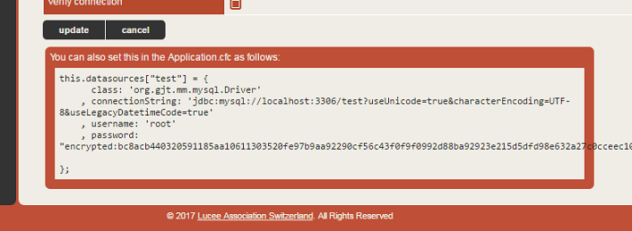}So, the first block simply declares a struct that represents a datasource connection. Then I use that struct as my datasource. You might be thinking, "where the heck did he get that struct??". Glad you asked. Start up a Lucee 4 server, edit a datasource that has the connection properties you want and then at the bottom of the edit page you'll see a code sample you can just copy and paste from. This is the code for an Application.cfc, but you can re-use the same struct here.